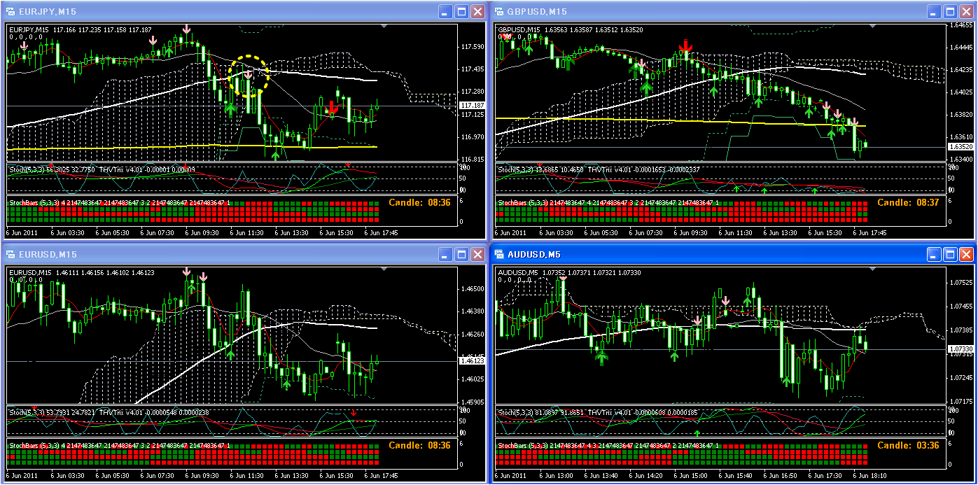 買いサインが、15分足で、ユーロ/円、ユーロ/ドル、ポン/ドルの三つ、