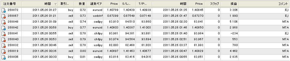 しかしそのうち、ある通貨ペアだけで、(両EAで)11回売買があり