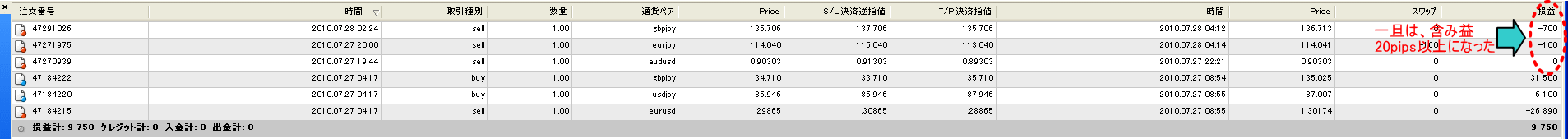 そのうち3回は、ブレークイーブン(20pips)が利いて