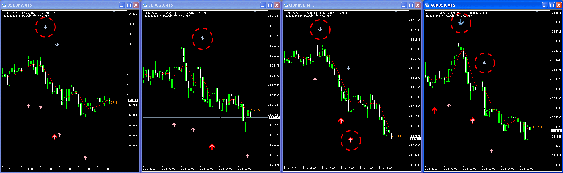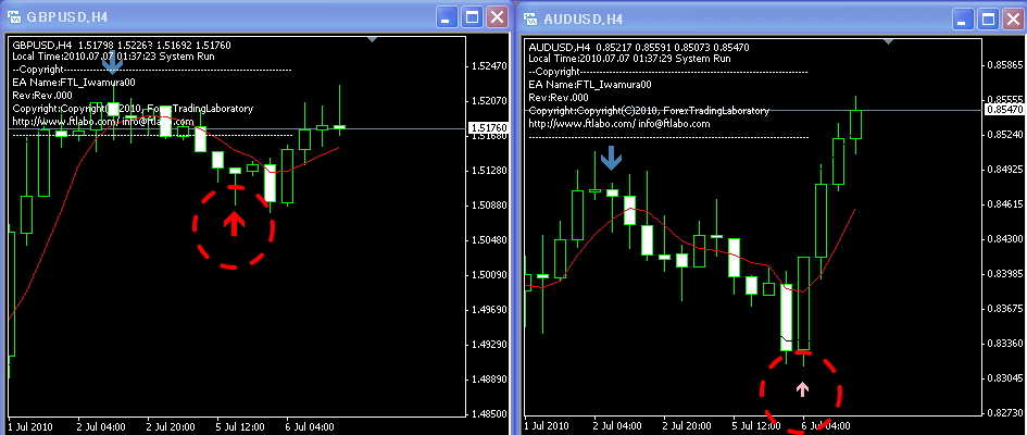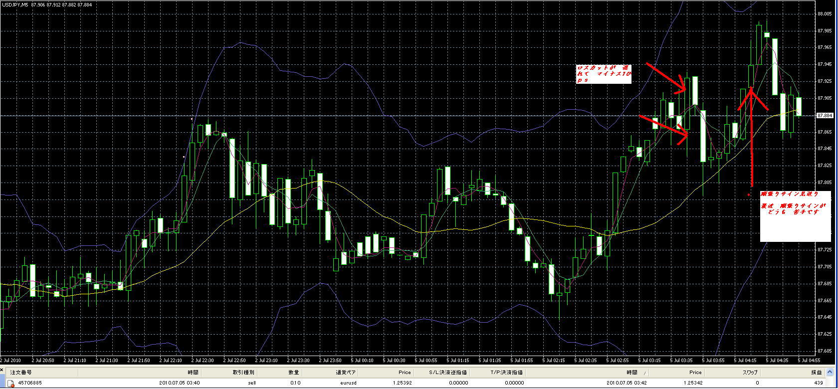 4時間足では、今現在、雲に跳ね返された状態となりつつありますね。
